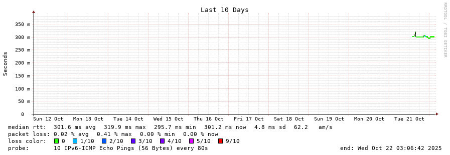 30 > 2a02:2f05:21ff:ff01::2 (2a02:2f05:21ff:ff01::2) [AS8708] 303.561ms 303.583ms 303.550ms