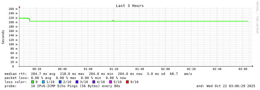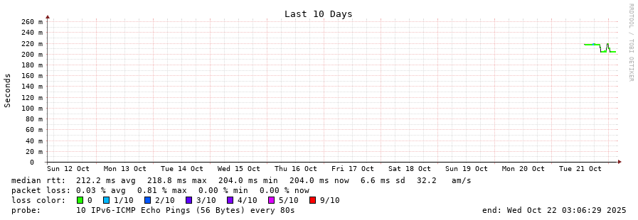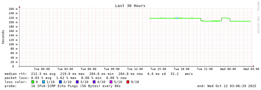 traceroute to 2a0b:2f00:0:234::151 (2a0b:2f00:0:234::151), 30 hops max, 80 byte packets - Generated at 2025-10-21 22:30:01